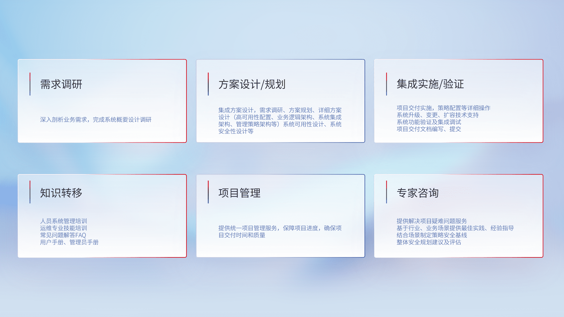 针对客户行业特性,,将宏观的安全战略和需求,,通过专业的交付服务,,,,实现项目落地,,,为客户提供标准规范的集成交付服务。。